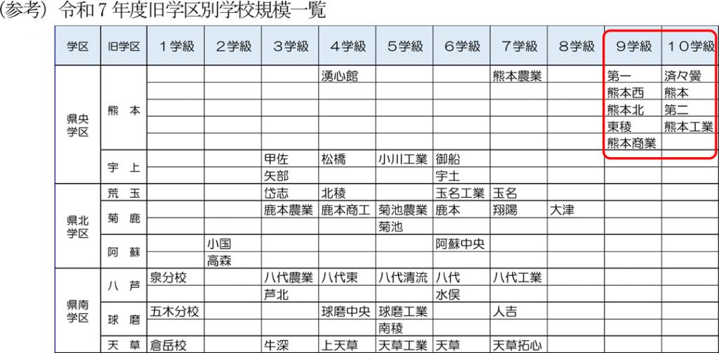 すでに倍率の高い高校ですら削減対象になるくらいですから、当然こちらも削減を進めることになるとは思います。特に、人口減少が著しい市町村や、郡部でありながら熊本市内への交通の便がよい地域では、地元の高校に進学する生徒が急激に減っています。
