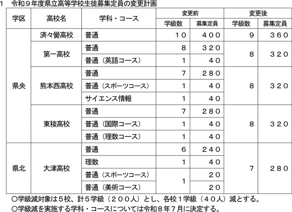 先述のように普通科を先行して定員削減を進めているため、普通科の定員を40名削減し1学級減らす、というのが最も有力な予測です。また、普通科普通コースのみの高校(今回の対象では熊本高校、済々黌高校、玉名高校、人吉高校)はこちらで確定とみてよいでしょう。