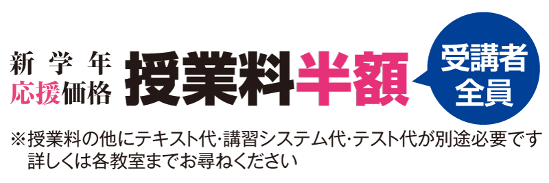 | テキスト代: | 小中:1教科1,320円 高:1教科1,870~2,365円 (高校生はすでにテキストを持っている場合、不要) |
